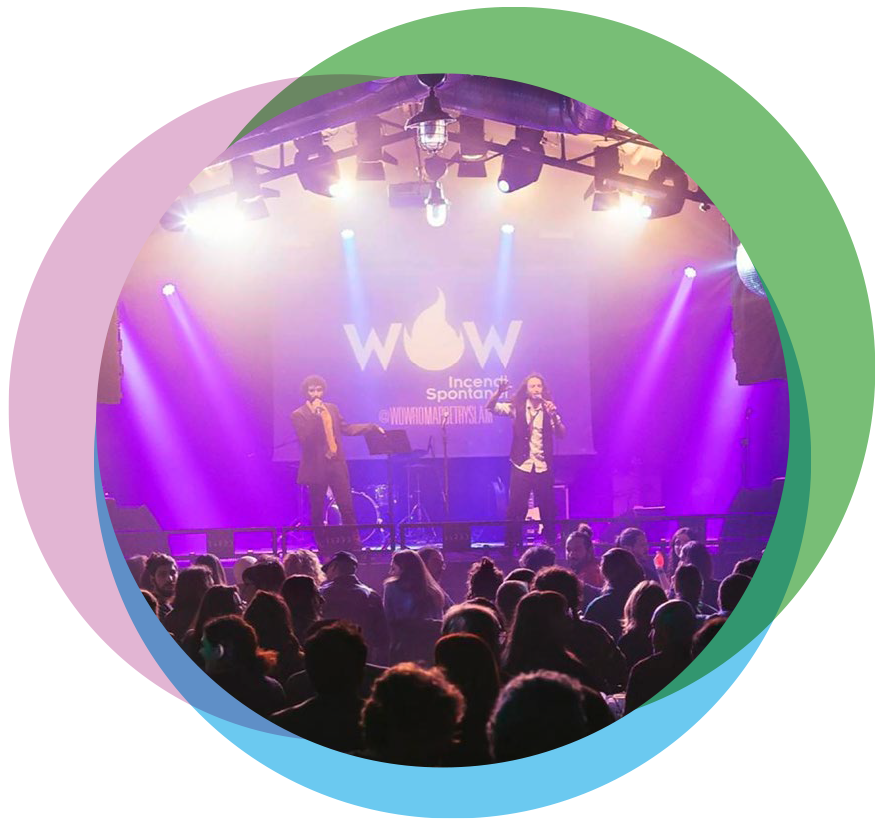 WOW – Incendi Spontanei è un collettivo di artisti performativi e organizzatori di eventi culturali che dal 2018 promuove la diffusione delle arti performative a Roma, in cui ha sede, in tutta Italia e nel mondo. La formazione attuale è costituita dal co-fondatore Dome Bulfaro, Giuliano Logos (Campione del mondo di Poetry Slam 2021), Lorenzo Maragoni (Campione del Mondo di Poetry Slam 2022), Gabriele Ratano (Campione Italiano di Poetry Slam 2025), Olympia, Leonardo Scrima, Giulia Sara Arcovito, Davide Volpe.